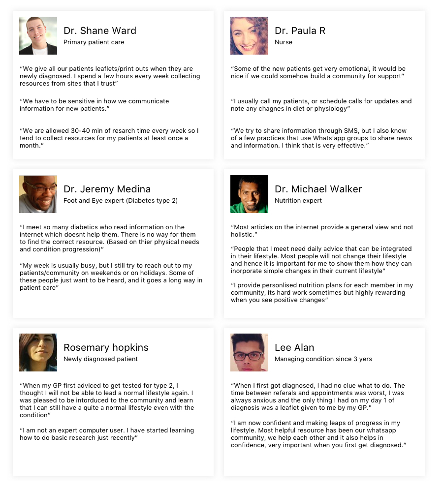 We had a few teams from NHS practices willing to work with us and we also managed to reach out to a few tier-2 weight management programs. I began interviewing all the NHS care givers that we knew, visiting various GPs across East London boroughs. I also interviewed a lot of new patients and patients who have been managing their condition since a long time. Here are a few quotes from the interviews which I later used to create a journey map. (Names and designations changed.)